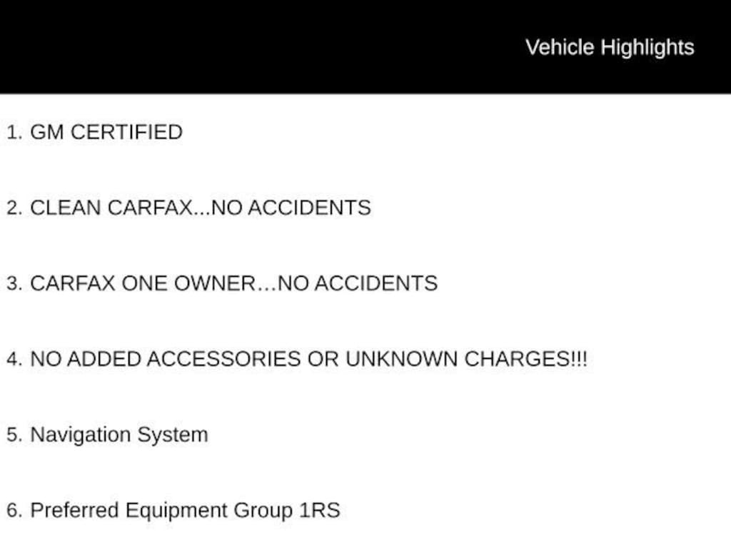 THIS VEHICLE IS PRICED TO THE CURRENT MARKET USING REAL DATA, NOT INFLATED FOR NEGOTIATION REASONS. THE ADVERTISED PRICE INCLUDES EVERYTHING INSTALLED---NO HIDDEN ACCESSORIES, NO MANDATORY PACKAGES, AND NO LAST MINUTE PRICE INCREASES WHEN YOU ARRIVE. WHAT YOU SEE ONLINE IS THE ACTUAL PRICE YOU PAY IN STORE. tax, tag, and doc fee excluded. Recent Arrival! GM CERTIFIED, CLEAN CARFAX...NO ACCIDENTS, CARFAX ONE OWNER...NO ACCIDENTS, NO ADDED ACCESSORIES OR UNKNOWN CHARGES!!!, Navigation System, Preferred Equipment Group 1RS. 19/26 City/Highway MPG
