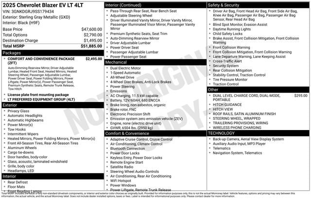 THIS VEHICLE IS PRICED TO THE CURRENT MARKET USING REAL DATA, NOT INFLATED FOR NEGOTIATION REASONS. THE ADVERTISED PRICE INCLUDES EVERYTHING INSTALLED---NO HIDDEN ACCESSORIES, NO MANDATORY PACKAGES, AND NO LAST MINUTE PRICE INCREASES WHEN YOU ARRIVE. WHAT YOU SEE ONLINE IS THE ACTUAL PRICE YOU PAY IN STORE. tax, tag, and doc fee excluded Sterling Gray Metallic 2025 Chevrolet Blazer EV LT AWD 1-Speed Automatic Electric Motor NO ADDED ACCESSORIES OR UNKNOWN CHARGES!!!, 2-Way Power Driver Lumbar Seat Adjuster, 2-Way Power Passenger Lumbar Seat Adjuster, 6-Way Power Passenger Seat Adjuster, 8-Way Power Driver Seat Adjuster, Comfort & Convenience Package, Evotex Seat Trim, Heated Driver & Fr Passenger Seats Cushion & Seatback, Heated Steering Wheel, Hitch Guidance, Hitch View, Inside Rear-View Auto-Dimming Mirror, Navigation System, Power-Adjustable Power-Folding Heated Mirrors, Preferred Equipment Group 4LT, Programmable Hands Free AutoSense Power Liftgate, Wireless Phone Charging, Wrapped Steering Wheel.