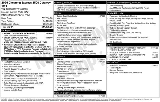 THE ADVERTISED PRICE INCLUDES EVERYTHING INSTALLED---NO HIDDEN ACCESSORIES, NO MANDATORY PACKAGES, AND NO LAST MINUTE PRICE INCREASES WHEN YOU ARRIVE. WHAT YOU SEE ONLINE IS THE ACTUAL PRICE YOU PAY IN STORE Summit White 2026 Chevrolet Express 3500 Work Van Cutaway RWD 8-Speed Automatic 6.6L V8 NO ADDED ACCESSORIES OR UNKNOWN CHARGES!!!, Cruise Control, Driver Convenience Package, Power Convenience Package, Power Door Locks with Lock-Out Protection, Power Windows, Preferred Equipment Group 1WT, Tilt Steering Wheel.