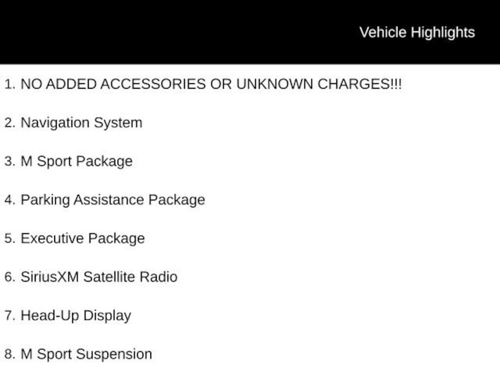 Recent Arrival! NO ADDED ACCESSORIES OR UNKNOWN CHARGES!!!, Active Park Distance Control, Adaptive Full LED Lights, Aerodynamic Kit, Automatic High Beams, Enhanced USB & Bluetooth (ZEB), Executive Package, Gesture Control, Head-Up Display, Heated Front Seats, LED Fog Lights, M Sport Package, M Sport Pkg, M Sport Suspension, M Steering Wheel, Navigation System, Parking Assistance Package, Parking Assistant Plus, Power Rear Sunshade, Power Tailgate, Rear-View Camera, SensaTec Dashboard, Shadowline Exterior Trim, SiriusXM Satellite Radio, Soft-Close Automatic Doors, Surround View w/3D View, Wheels: 19 x 8 M Double-Spoke (Style 664M), Wireless Charging, Without Lines Designation Outside. 22/29 City/Highway MPG Odometer is 20158 miles below market average!