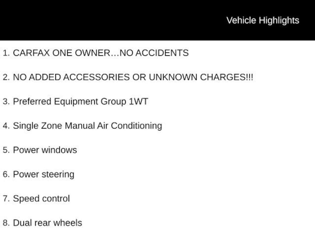 Recent Arrival! CARFAX ONE OWNER...NO ACCIDENTS, NO ADDED ACCESSORIES OR UNKNOWN CHARGES!!!, Bumpers: body-color, Dual rear wheels, Front Bucket Seats, Passenger door bin, Power steering, Power windows, Preferred Equipment Group 1WT, Single Zone Manual Air Conditioning, Speed control, Wheels: 16 x 6.0 K Steel.