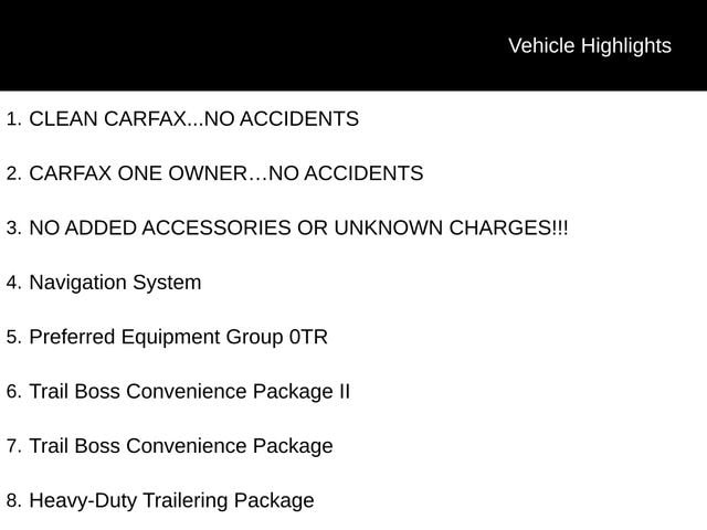 Recent Arrival! CLEAN CARFAX...NO ACCIDENTS, CARFAX ONE OWNER...NO ACCIDENTS, NO ADDED ACCESSORIES OR UNKNOWN CHARGES!!!, 8-Way Power Driver Seat Adjuster, Advanced Trailering Package, Chevy Safety Assist, Electronic Automatic Cruise Control, EZ-Lift & Lower Tailgate, Heavy-Duty Trailering Package, Manual Rear-Sliding Window, Navigation System, Power Driver Lumbar Control Seat Adjuster, Preferred Equipment Group 0TR, Rear-Window Electric Defogger, StowFlex Tailgate Storage Compartment, Tailgate Keyed Cylinder Lock, Trail Boss Convenience Package, Trail Boss Convenience Package II, Trailering App.