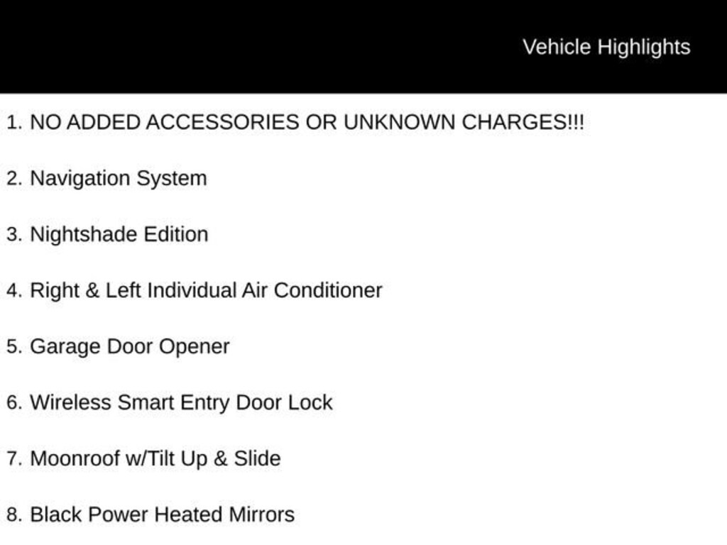 Recent Arrival! NO ADDED ACCESSORIES OR UNKNOWN CHARGES!!!, Black Power Heated Mirrors, Black Roof Rails, Garage Door Opener, Moonroof w/Tilt Up & Slide, Navigation System, Nightshade Edition, Right & Left Individual Air Conditioner, Wireless Smart Entry Door Lock.